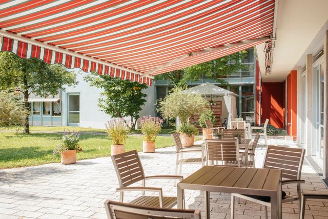 Die hellen und freundlichen Zimmer sind mit einem Pflegebett und einem Nachttisch ausgestattet, damit die Bewohner*innen eigene Möbel mitbringen und sich ganz nach ihren persönlichen Wünschen einrichten können. Selbstverständlich haben alle Zimmer